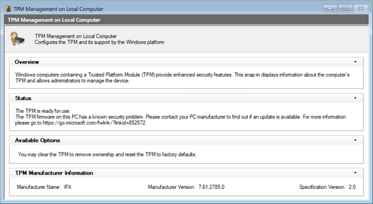 Neither Windows Update nor Lenovo Companion nor automatically installed or informed me about the availability of this security update. Windows Update did kind-of-but-not-really address this issue with an update that added a notice about the outdated firmware in the Windows Trusted Platform Module (TPM) Management utility.